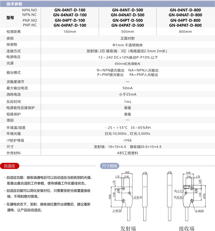這款超薄光電是小光斑對射型,采用小光斑尺寸設計,500mm處光斑僅為中30mm,并配備方便觀察的雙色指示燈--紅色電源指示燈與綠色輸出指示燈。